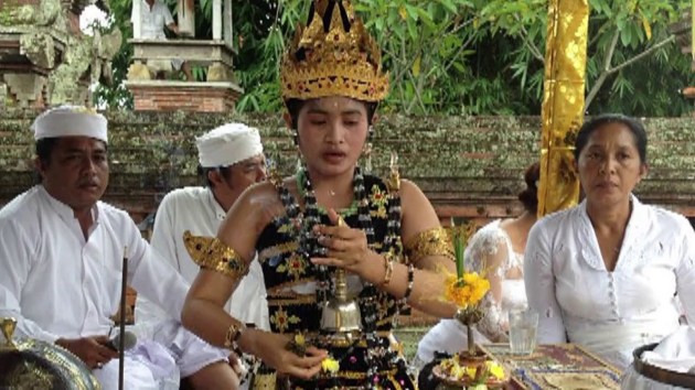 Bunga di buang ke depan (arah Banten) lalu diperciki tirtha