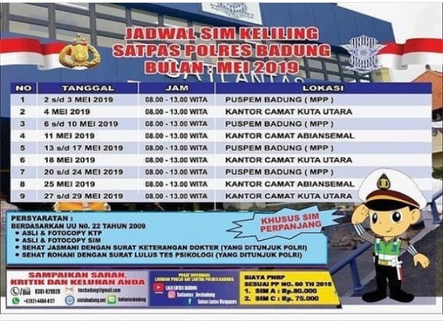 Pelayanan SIM keliling sangat memberikan manfaat yang sangat positif bagi masyarakat luas, POLRI sangat memahami kebutuhan masyarakat hingga muncul lah ide untuk membuka layanan publik ini lebih dekat dengan masyarakat. Di kabupaten Badung, Bali. Jadwal layanan SIM keliling di Badung Bali.