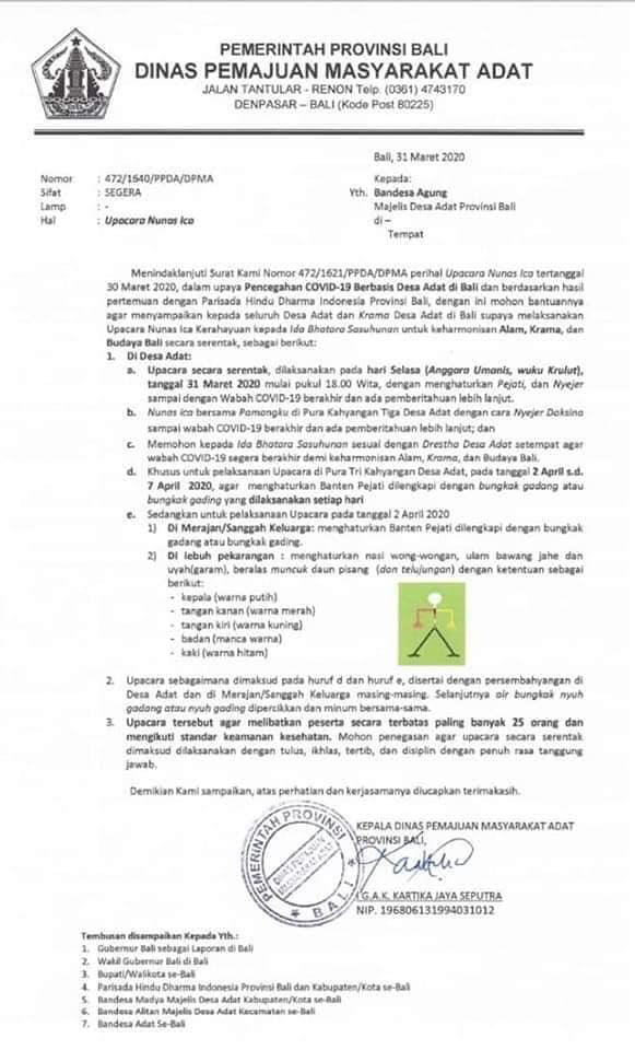 Beredar surat edaran tentang upacara nunas ica dibawah ini adalah mantra untuk nasi wong wongan yang akan dihaturkan tgl 2 April 2020. Postingan ini disadur dari FB Global Dewata. Semoga bermanfaat. Dan semoga kita semua senantiasa dalam wara nugraha Sang Hyang Widhi Wasa.
